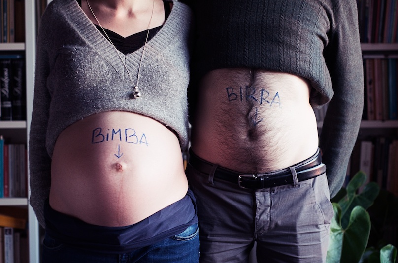 For the first one I placed a tiny pair of pink shoes on the bump of the future mom deciding to include in the frame part of the couch and the pictures on the wall to lock down the photo in a specific environment, in this case the living room.