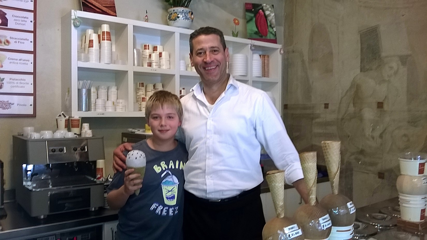 Today was a nice day to be out with my son in the Firenze Center. We toured some churches and ate some great pizza. Since it is a hot day in autumn, of course we had to go get some gelato (ice cream). My son mentioned a new place, at least to me, that has artigianale ice cream. All natural ingredients and the best vanilla ice cream in Italy.